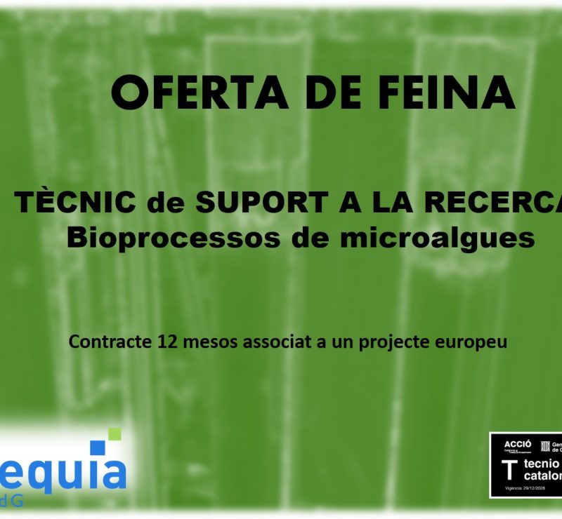 Oferta de feina: “Tècnic de suport a la recerca en bio-processos de microalgues” Author By Posted on March 30, 2026March 30, 2026 Investigador principal: Sebastià Puig (sebastia.puig@udg.edu)Lloc de treball: Parc de Recerca i d’Innovació de la UdGDurada: 1...